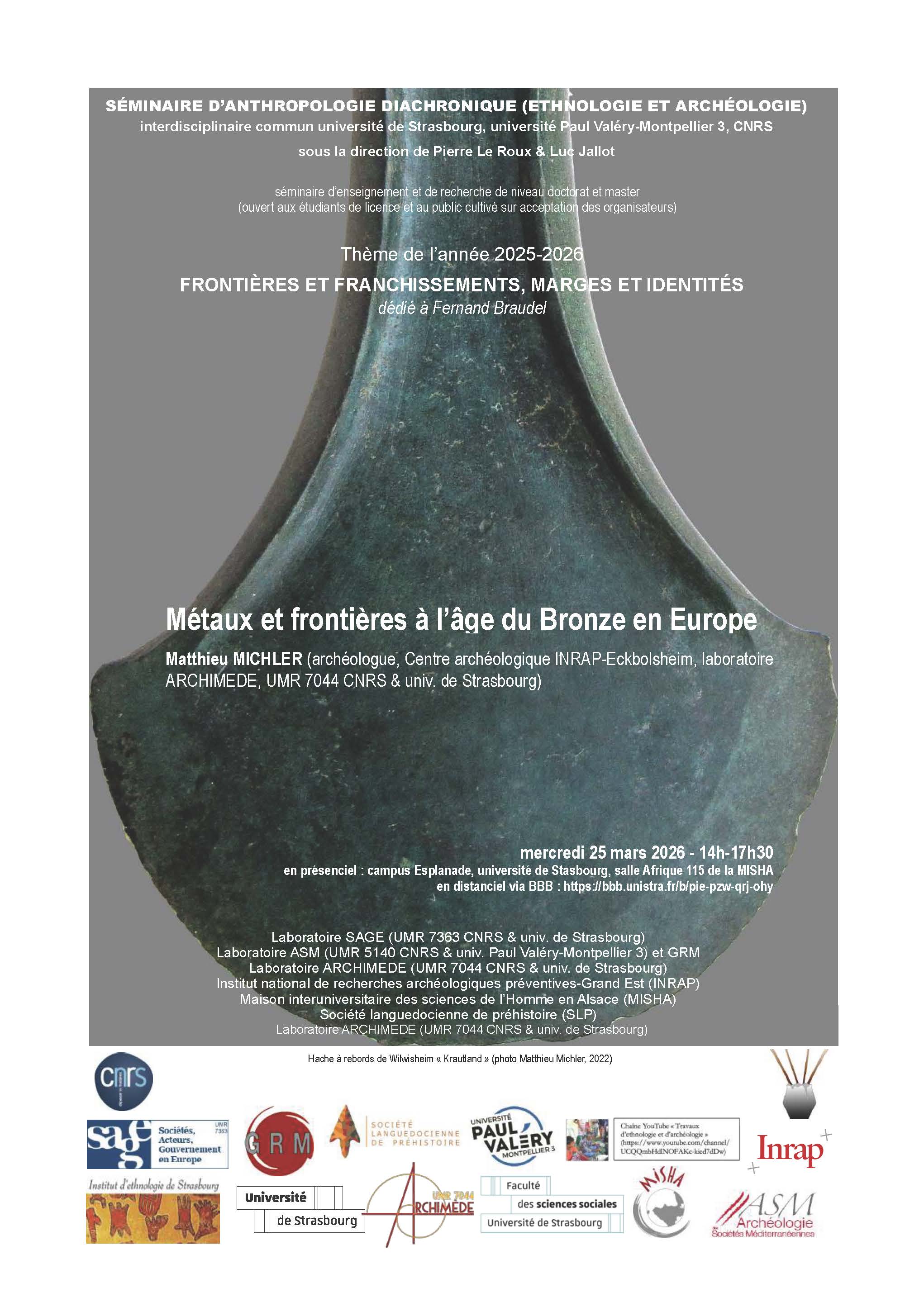 The Archaeology and Ancient History in the Mediterranean Area joint research unit (Archéologie et histoire ancienne: Méditerranée Europe – ArcHiMèdE) brings together researchers from the French National Centre for Scientific Research (Centre national de la recherche scientifique – CNRS), teacher-researchers from the University of Strasbourg (Unistra) and the Université de Haute-Alsace (UHA), archaeologists from the French Ministry of Culture and preventive archaeology specialists (Inrap, Archéologie Alsace, Antea archéologie, GéoArchéOn). It enjoys a privileged strategic location at the heart of Europe, which enables it to participate in major cross-border networks (Collegium Beatus Rhenanus, Franco-German Doctoral College) and to attract new partnerships. The UMR has an exceptional wealth of scientific resources, with its own research library at the Alsace Interuniversity House for the Social Sciences and Humanities (Maison interuniversitaire des sciences de l'Homme - Alsace (Misha) and a number of cultural heritage collections (Egyptian and Greco-Roman antiquities, numismatics, casts of ancient works, old photographs, including glass plates). It is also working on the publication of the Strasbourg National University Library's (Bibliothèque Nationale Universitaire de Strasbourg – BNUS) ancient collections (cuneiform tablets, papyri, ostraka). There is also the Zoological Museum's (Musée Zoologique) bone collection, which houses the bones of most of the mammals likely to be found in archaeological sites from the Mesolithic to the contemporary period in temperate Europe.